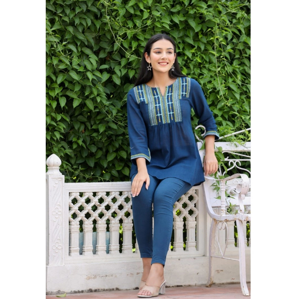 Casual 3/4th Sleeve Embroidered Cotton Kurti (Dark Green)