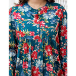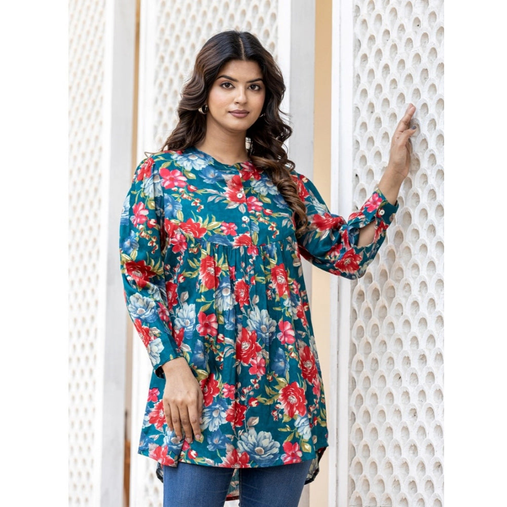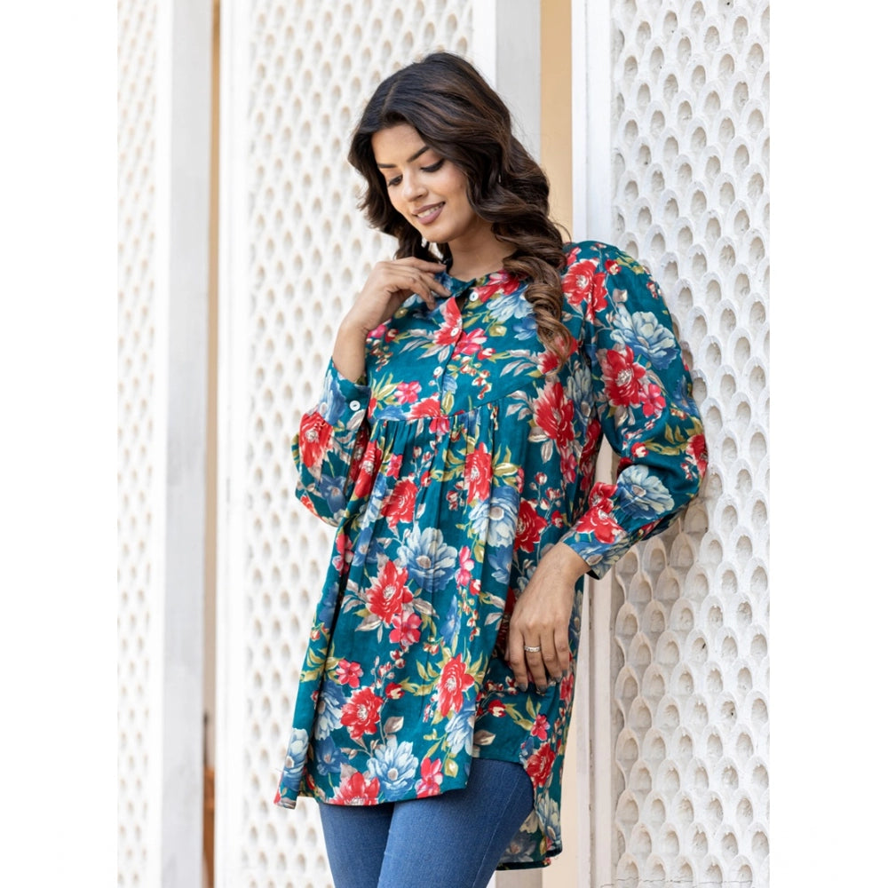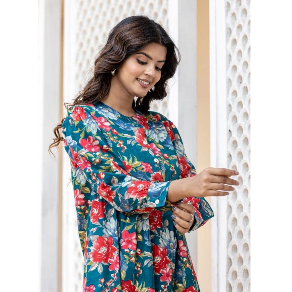 Casual 3/4th Sleeve Floral Printed Cotton Flex Kurti (Blue)
